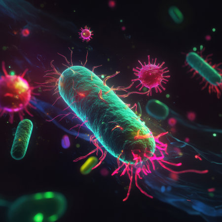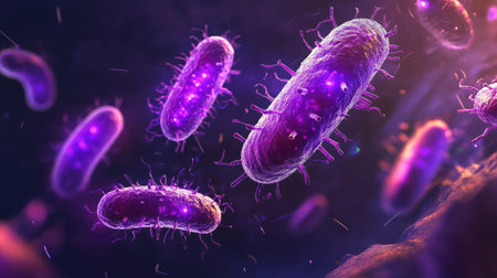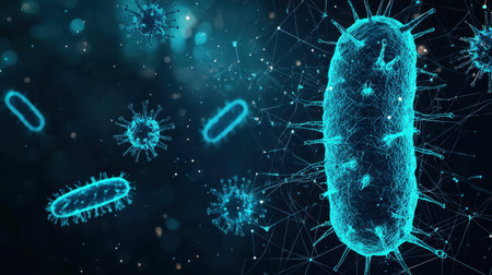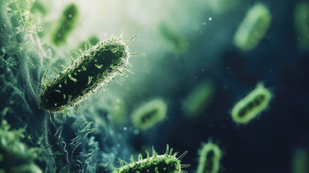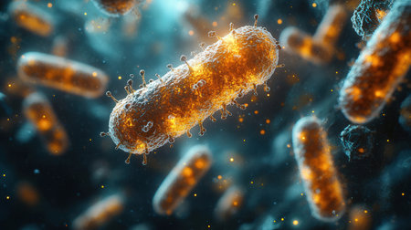 A close-up, glowing microscopic view of rod-shaped bacteria with spiky protrusions in a dark, vibrant...