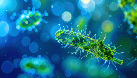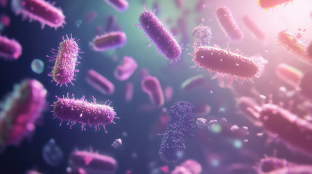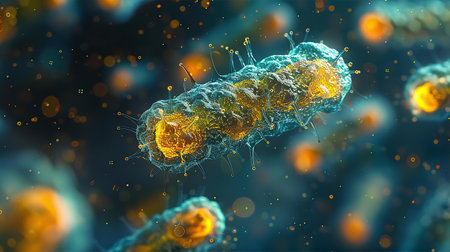 A detailed and vibrant depiction of bacteria viewed under a microscope, showcasing glowing details and abstract backgrounds, perfect for scientific and educational use.