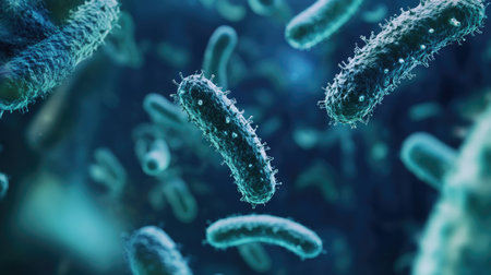 A highly detailed microscopic view of bacteria, representing microbiology, infections, science, biotechnology, disease research, and microbial life in healthcare