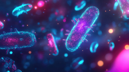 An intricate digital representation of bacteria displaying vibrant colors and glowing elements, highlighting the fascinating world of microscopic life in a stunning abstract setting.