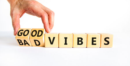 Good or bad vibes symbol. Concept words Good vibes Bad vibes on beautiful wooden blocks. Beautiful white table white background. Businessman hand. Business good or bad vibes concept. Copy space