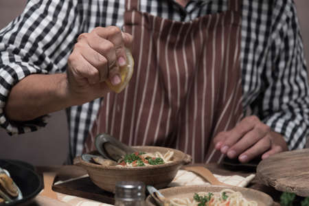 Handsome bearded cheef cook prepairing spaghetti on a kitchen, Chef cooks meal