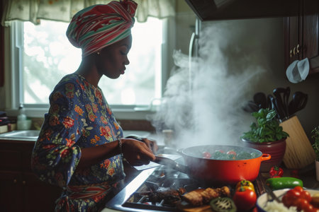 Black mature woman cooks at kitchen. Work restaurant. Generate Ai