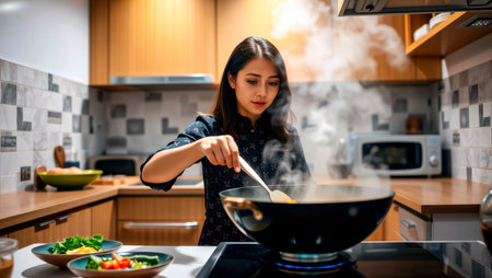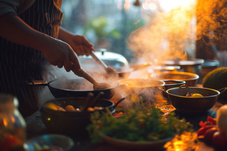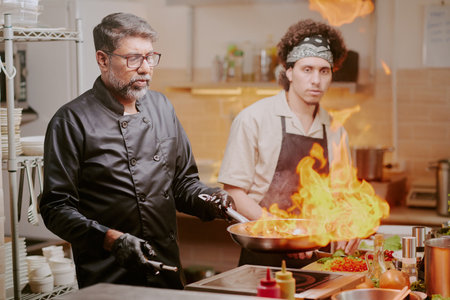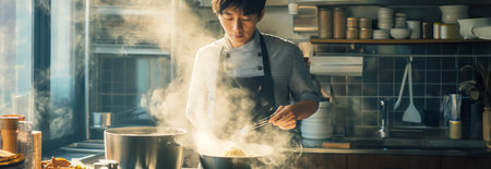 A chef is cooking food in a pan with smoke coming out of it. The steam and smoke give the impression of a busy kitchen, with the chef working hard to prepare a meal. Concept of energy and excitement
