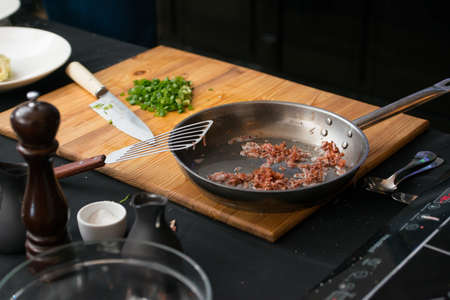 Steam from frying pan. Black portable cooker. Cooking tasty food requires mastery. What's for dinner.