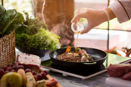 Bottle pours liquid onto pan. Meat and green vegetable. Fried beef and asparagus. Chef makes flambe steak.