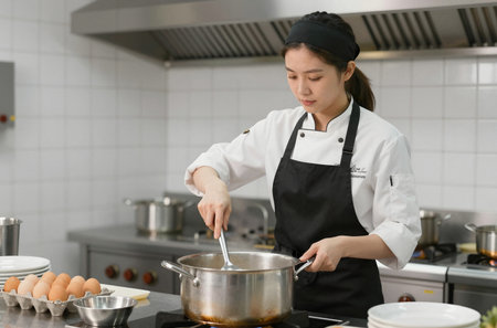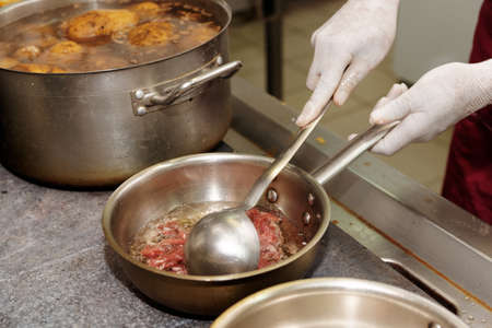 Close-up of chef in white shirt standing near the stove and stirring the soup while working in the kitchen of the restaurant