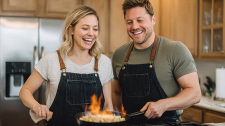 A cheerful couple enjoys cooking together in a stylish kitchen, fostering warmth and connection. Their laughter and enthusiasm create a vibrant cooking atmosphere.