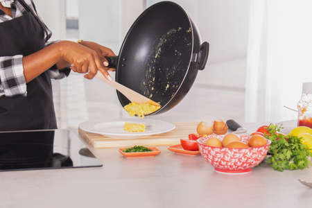 Hand of young woman with heat resistant spatula mixing ingredients in frying pan