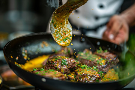 Chef grilling steak in creamy lemon butter or cajun sauce with aromatic herbs for a flavorful dish