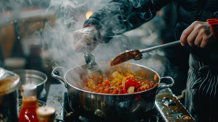 A close-up of a person stirring a pot of homemade sauce on the stove, with steam rising and a focus on the rich, textured sauce.