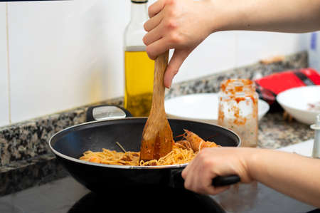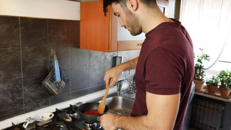Closeup of man cooking pasta sauce in the kitchen with black pan.