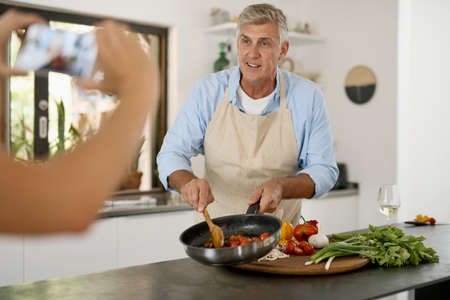 Man records on phone the process of cooking by asian chef in a professional kitchen