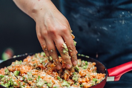 Female Chef Mixing Salmon with Avocado in a Bowl - Isolated Action with only Hands Visible, Vintage Film Look