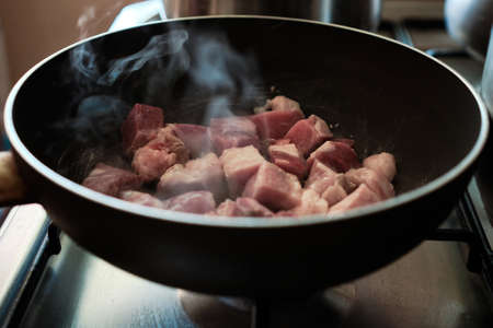 Woman stirring pork roasted on a frying pan. Pork meat in a frying pan is cut by large cubes. Close up view