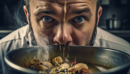 One man cooking gourmet seafood over flame generated by artificial intelligence