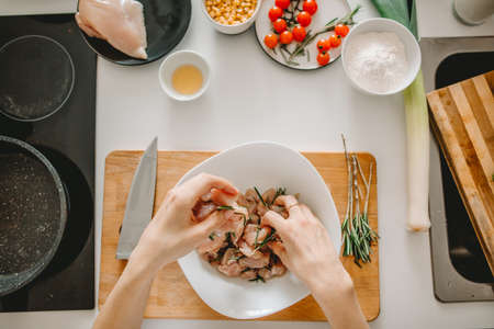 Woman uses a spatula to prepare chicken teriyaki in a pan on the stovetop in the kitchen. Healthy and delicious food at home.