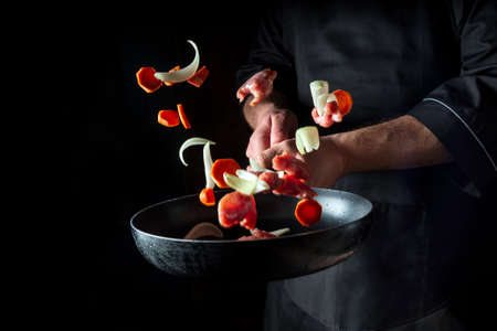 The hand of professional chef throws up meat chunks with vegetables in frying pan on black background. Concept of preparing food
