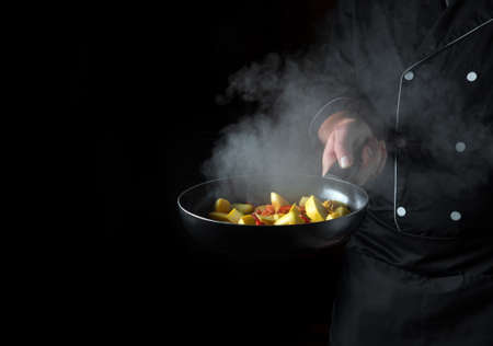 Professional chef prepares vegetables in a frying pan. Cooking healthy vegetarian food and meal on a dark background. Free advertising space.
