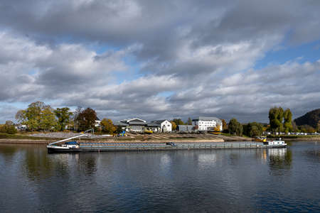 November 1, 2021 - Koblenz, Germany: A river barge at the German Corner were rivers Rhein and Mosel meet