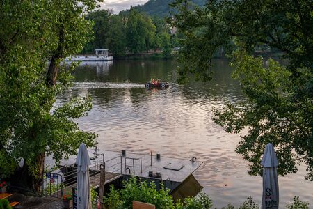 Scenic panorama cityscape view of Moldava river boat Prague in Czech Republic