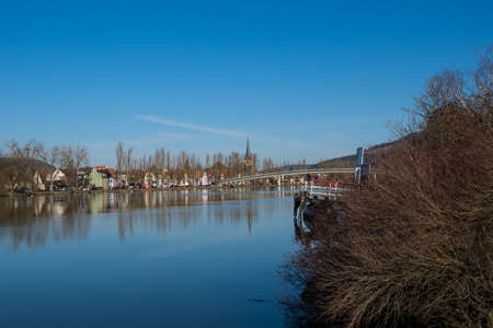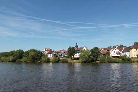 River called Main with the view village called Margetshoechheim. In the foreground some tiny boats called Schelch.