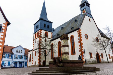 View from castle on old german town Miltenberg am Main river, St. Jacob catholic church, main bridge. Odenwald, Bavaria, Germany