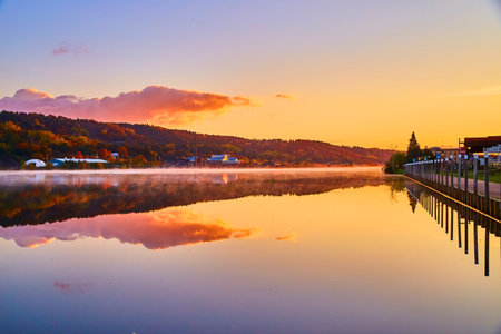 scenic view of the river and pier near the hills in autumn and flowers in the foreground