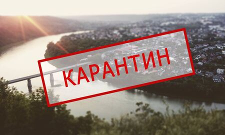 Crisis in the tourism industry due to outbreaks of coronavirus. Stopped traveling, red text QUARANTINE in Russian, Ukrainian, blue sky background of the city, village. Kamyanets-Podilsky, Zalishchyky, Ukraine.