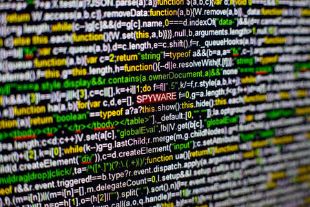 Macro photo of computer screen with program source code and highlighted SPYWARE inscription in the middle. Computer script on the screen with virus in it. Cyber security concept.