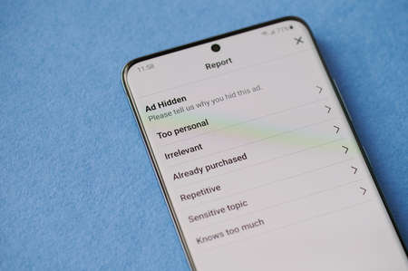 New york, USA - June 28 2021: Ad hidden reportin facebook on smartphone screen close up