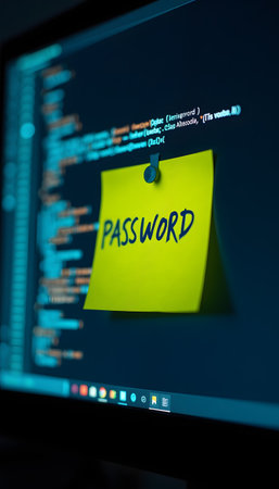 Sticky note with password on a computer screen displaying programming code