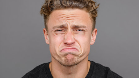 Young Adult with Curly Hair Showing Expression of Anger and Frustration Against Plain Background in Portrait Mode