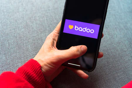 Young woman holding a smartphone with a Badoo dating app on screen. IPhone 11 with a social media chatting and meeting new people app logo.