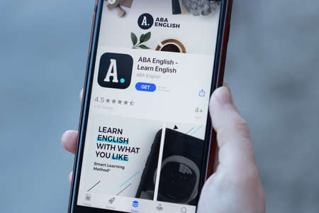New York, USA - 1 May 2020: ABA English Learn app logo close-up on phone screen, Illustrative Editorial.