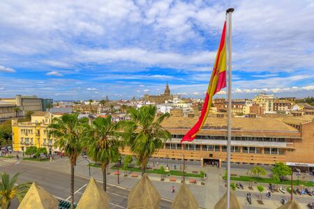Aerial view of Seville city skyline with Spanish flag from Golden tower or Torre del Oro. In the distance, the famous Cathedral of Saint Mary of the See. Andalusia, Spain.