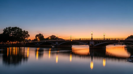 As the sun sets, the golden hour illuminates the historic skyline, creating stunning reflections in the calm river below, with a charming bridge connecting the banks.