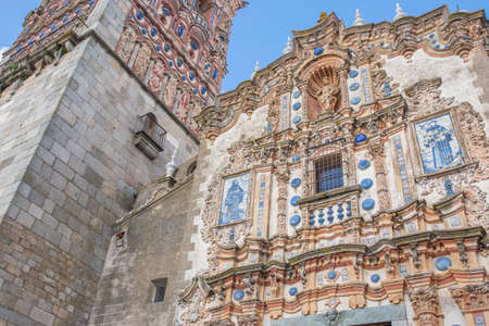 Badajoz, Spain - 24 June 2022: Facades of the Church of the Holy Mother of the Sacrament in the Plaza Alta of Badajoz (Spain)