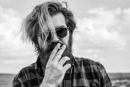 handsome bearded guy with stylish hair smoking cigarette, harmful habit