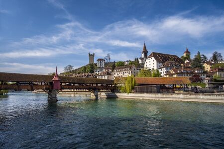 View to the old town buildings and wooden bridge over Reuss river in Lucerne in Switzerland