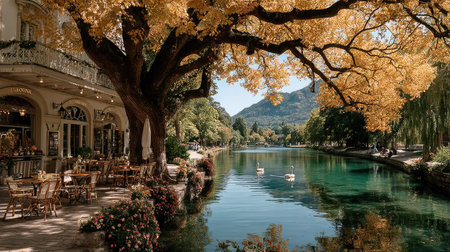 A scenic autumn landscape displays a river flowing through a town surrounded by trees with colorful foliage. Buildings with red tile roofs line the riverbanks. The composition captures the natural beauty, with warm sunlight illuminating the scene on a clear day.