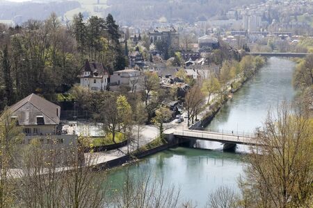 Bern, Switzerland - April 18, 2019: River Aare flows through the town, there are two bridges and there are many houses in the area.