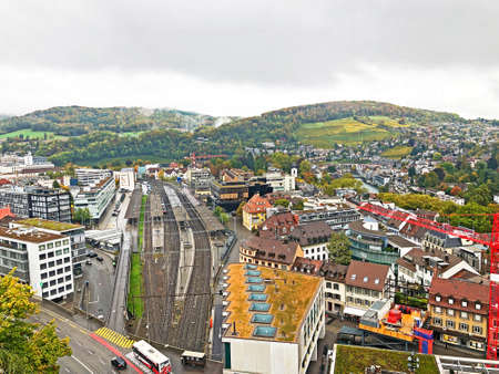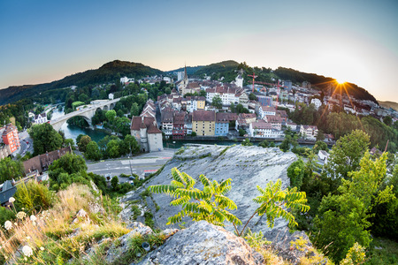 BADEN, AARGAU, SWITZERLAND - JULY 1, 2015: View from Mountain Lagern to the city of Baden and river Limmat at sunset on July 1, 2015. Baden is a municipality in the Swiss canton of Aargau.