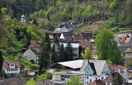 Cute village in Germany on a hillside, apartment buildings on the background of the forest