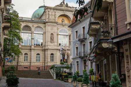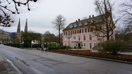 Baden-Baden, Germany - December 29, 2021: People going near historic buildings at the famous old town of Baden-Baden