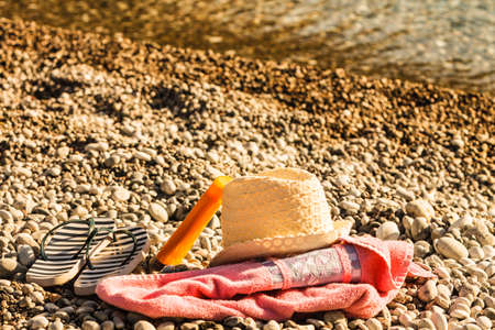 Beach accessories on a towel for sunbathing. Sunny hat and flip flops, stone rocks sand.