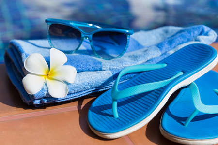 Blue slippers, sunglasses and towel on border of a swimming pool - holiday tropical concept