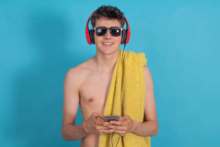 young teenager or student isolated with sunglasses and beach or pool towel surprised