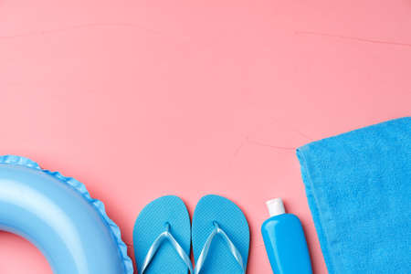 Beach concept with blue rubber ring, towel, flip-flops and moistrizer on pink background