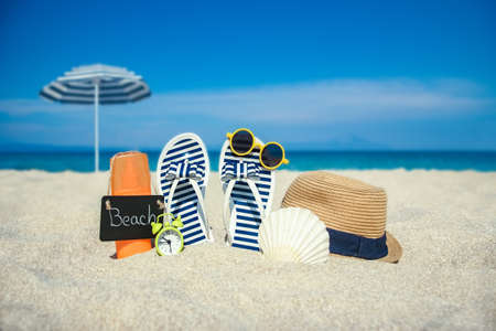 Summer holiday vacation beach accessories flat lay top view with copy space
